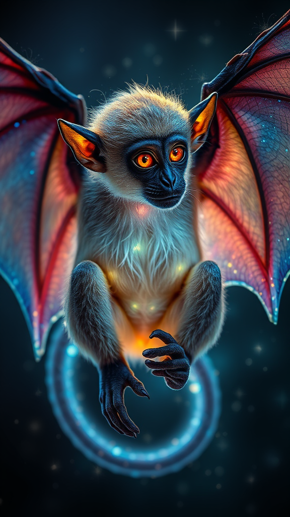 Imagine an enchanting, bioluminescent creature that embodies the seamless fusion of a monkey and a bat. It possesses the nimbleness and dexterity of a primate, elevated by the nocturnal mastery and winged elegance of a bat. This remarkable being boasts an entrancing appearance, where its shimmering fur smoothly transitions into leathery wings, creating a captivating iridescent spectrum that exudes an ethereal aura. Its eyes gleam with a bright, intelligent gaze, as though carrying the secrets of antiquity. The creature moves with a mesmerizing blend of fluid grace and formidable power, dancing effortlessly through the shadows, leaving behind a trail of sparkling enchantment that captivates any who behold it.