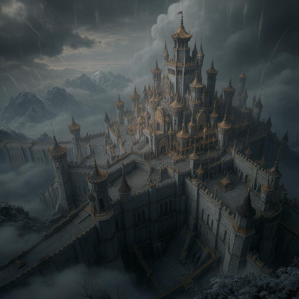 Imagine an ultra-detailed aerial perspective of a colossal imperial fortress, entrenched in a dark fantasy world. The castle, adorned with intricate embellishments, towers majestically with sweeping turrets and sprawling ramparts. Enveloped in a mystical atmosphere, it exudes an archaic charm under the soft embrace of volumetric lighting. The photorealistic depiction captures every nuance and shadow, rendering the scene in stunning hyperrealism. Its grandiose, maximalistic architecture is complex yet harmonious, drawing the viewer into a world where realism seamlessly interlaces with the mythical.