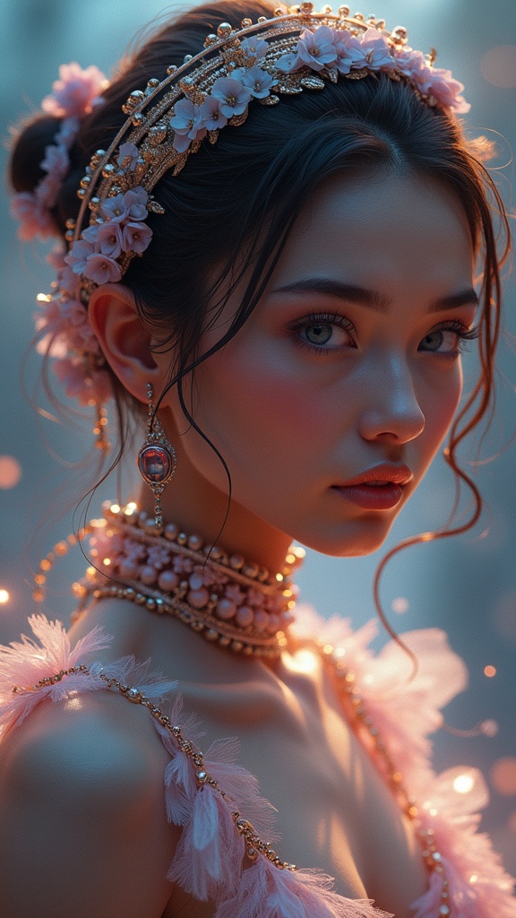 View this AI-generated image featuring imagine a highly detailed 8k portrait of a stunning galactic prima ballerina with a hint of clowncore embodying a futuristic russian cyborg college girl her features reflect the golden ratio set against a captivating sci fi fantasy backdrop elegantly merging cy
