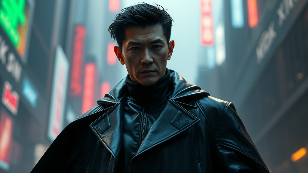 Imagine Donny Yen embodying a futuristic supervillain, cloaked in a sleek, obsidian black coat that shimmers with an otherworldly sheen. The setting is a hyper-realistic, photorealistic environment rendered with 8k resolution using the power of the Unreal Engine. This 3D render captures every intricate detail, from the subtle reflections on his coat to the intensity in his eyes. The atmosphere is charged with a sense of impending doom, yet alluring with its ultra-modern aesthetic. The composition follows an aspect ratio of 9:16, creating a vertical composition that accentuates his commanding presence. Rendered in a niji-inspired style that is expressive and dynamic, with a sensitivity setting of 400 to enhance dramatic contrasts and vibrant details, this image is both striking and unforgettable.