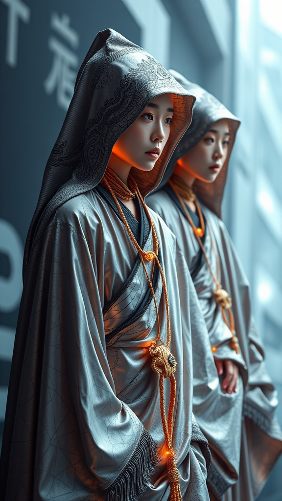 Imagine futuristic techno-monks adorned in avant-garde digital streetwear, blending ancient wisdom with modern cryptocurrency culture. They embody a serene cyber spiritualism, each garment reflecting intricate, photorealistic textures and patterns reminiscent of blockchain networks. The ensemble combines sleek, metallic fabrics with organic, flowing forms, symbolizing the harmony between technology and nature. These visionary fashion pieces are accentuated with luminous, iridescent threads and minimalist, holographic accessories that echo the ethos of a digital utopia.