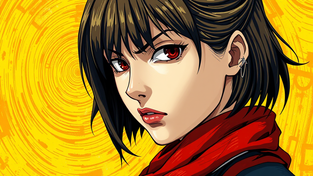 Imagine Mikasa Ackerman in the style of Vincent van Gogh, depicted in a highly detailed portrait. Her expression is fierce and intense, embodying aggression. She wears a vivid red scarf that stands out against the textured swirls reminiscent of Van Gogh's technique. The background is a vibrant yellow, providing a dramatic contrast, with hints of bold, swirling brushstrokes typical of Van Gogh's artwork, blending anime aesthetics with post-impressionist flair.
