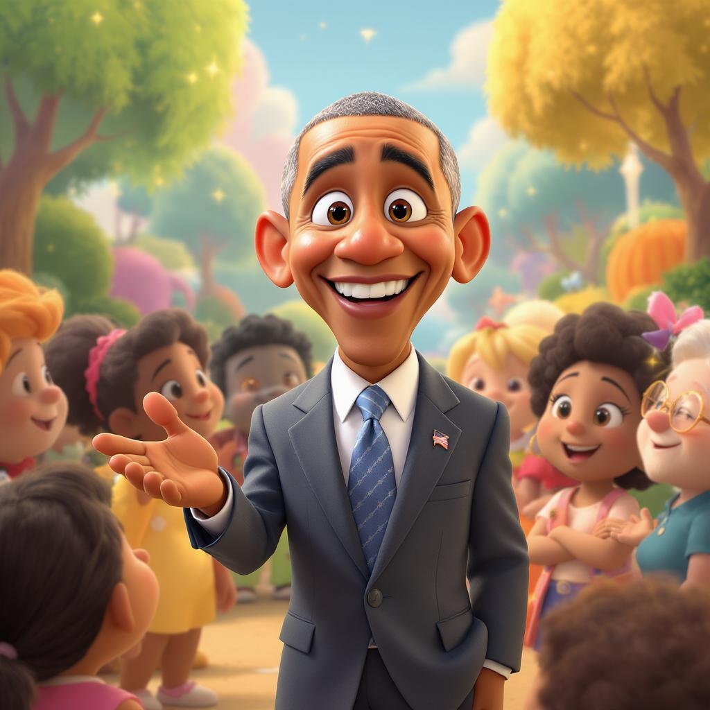 Imagine President Obama reimagined as a Pixar character: a charismatic and wise animated leader with an infectious smile, animated features that highlight his expressive eyes and reassuring demeanor. He sports a tailored, modern suit with a friendly, approachable demeanor. Surrounded by a diverse ensemble cast, he navigates colorful worlds, inspiring hope and unity with his eloquent speeches and thoughtful actions, embodying the essence of a thoughtful leader in a vibrant, animated universe.