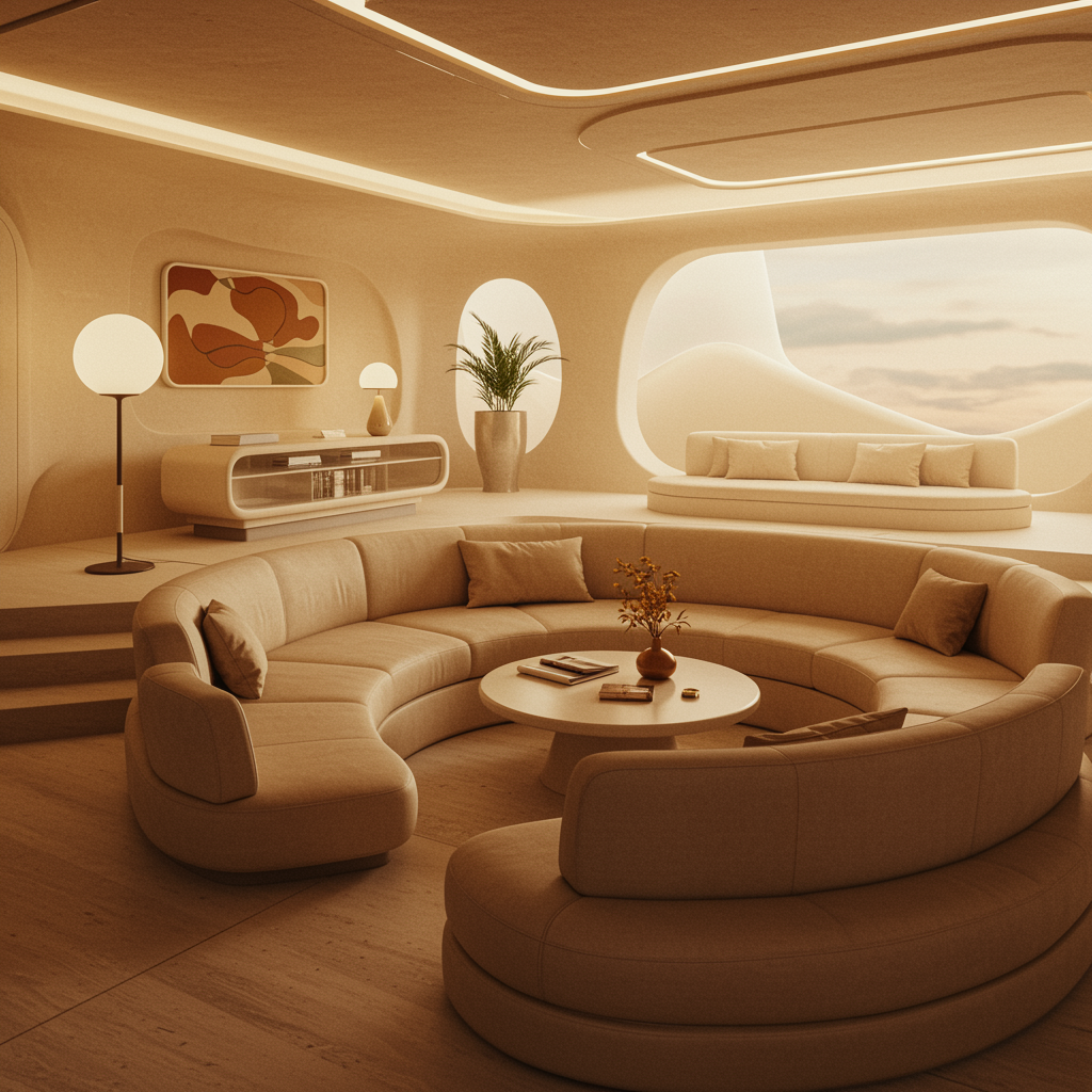 Imagine a luxurious sunken living room with a cozy conversation pit, inspired by 70s retrofuturism interior design. The space features plush, curved seating and a sleek, futuristic aesthetic. Soft, natural lighting floods the room, emphasizing a dreamy atmosphere in an ultra-realistic 8k render. A neutral beige color scheme dominates the space, complemented by subtle accents of warm earth tones. The architecture combines organic shapes with smooth lines, creating a harmonious blend of nostalgia and futuristic elegance.