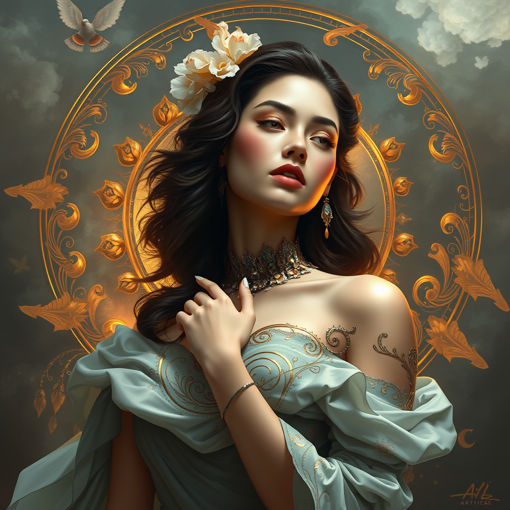 Imagine the most beautiful model inspired by the golden ratio, featuring intricate, elegant, and highly detailed elements blended into a digital painting style. This concept art piece will have the elegant touch of ArtStation aesthetics, capturing the smoothness and sharp focus typically seen in illustrations by Artgerm, Greg Rutkowski, and Alphonse Mucha. The artwork should be in ultra-high-definition 8k resolution, encapsulating the essence of classic and modern artistry combined.
