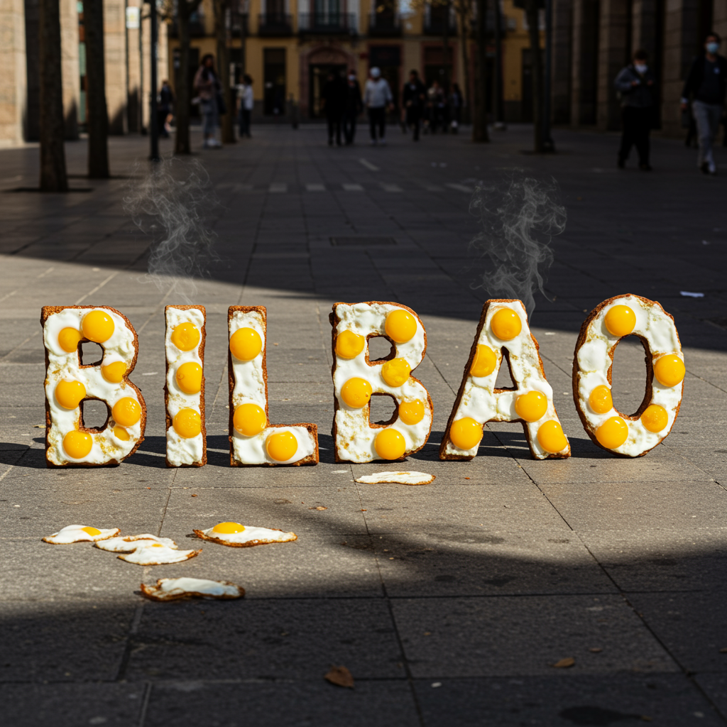 Imagine the word "BILBAO" sizzling on a sun-soaked city street, each letter crafted from perfectly cooked sunny-side-up eggs, their golden yolks glistening under the midday sun, casting tiny shadow halos on the sun-baked pavement.