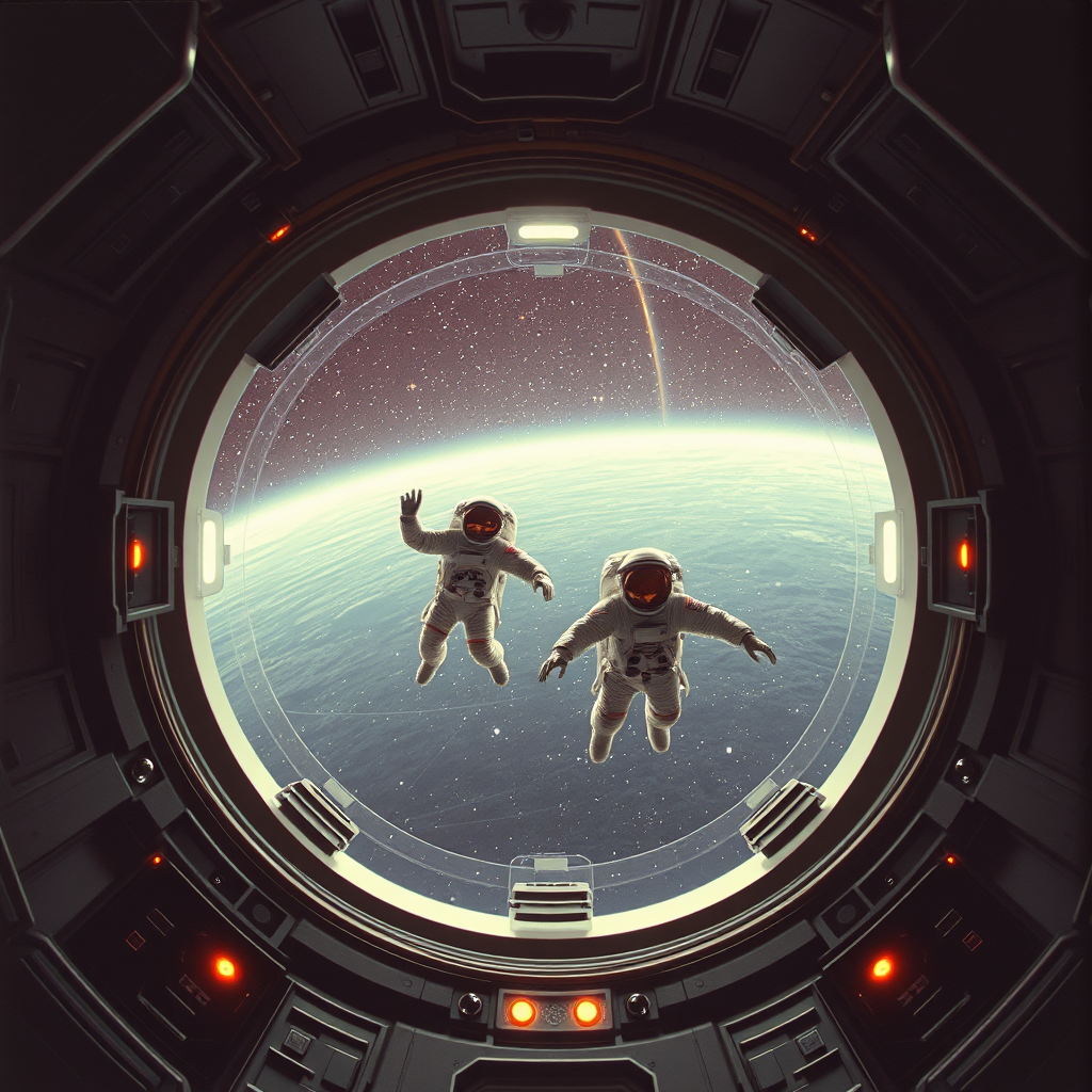 Imagining an 80s retro scene, envision the interior of a spacecraft from an overhead view, featuring two astronauts suspended in zero gravity. A round hatch remains ajar, framed by large black wheels and glowing lights, hinting at advanced technology. The scene opens to the vastness of space, with a starry sky creating a captivating backdrop. This composition echoes the minimalist yet futuristic aesthetic reminiscent of a John Berkey painting, exuding a sense of wonder and exploration in the infinite cosmos.