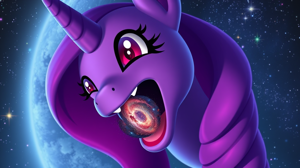 Immense Twilight Sparkle from My Little Pony, larger than a galaxy, drifting amid the cosmos, a tiny galaxy poised before her mouth, zoomed in close-up of her open mouth as she engulfs the galaxy, her eyes wide and shimmering with bright crimson hues, photo-realistic and hyper-detailed, capturing the interstellar wonder.