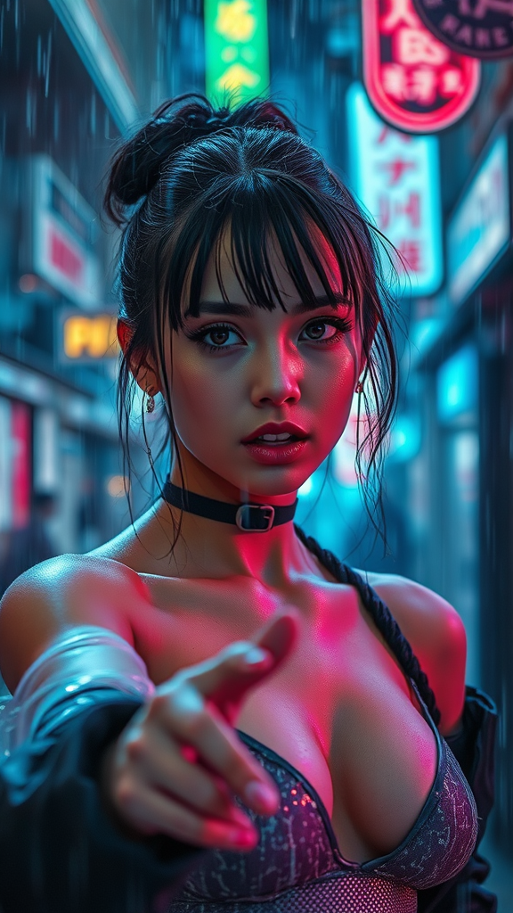 Immerse the audience in a rain-drenched dystopian future, painting a vivid scene of a young woman in striking cyberpunk attire. Her delicate features, accentuated by her flat chest and small breasts, shine with a distinctive allure as she performs a captivating action amidst the neon-lit, atmospheric streets reminiscent of Blade Runner. Utilize expert photographic lighting to enhance the realism of her expression, capturing every intricate detail in breathtaking 10k resolution. The setting pulses with a mix of vibrant colors and shadows, highlighting the gritty yet mesmerizing urban landscape.