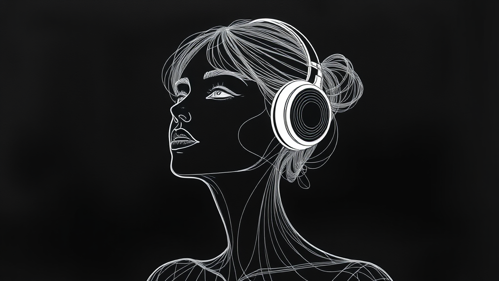 Immersed in sound, a figure wears headphones, intricately drawn with delicate white lines on a deep, inky black background, capturing serene focus; the proportions are elongated, emphasizing elegance and modern style.