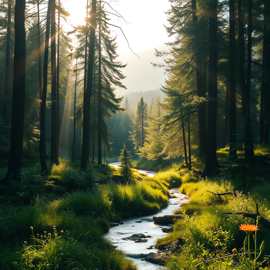 Immersive landscape with a forest bathed in soft, dappled sunlight filtering through tall trees, creating a play of light and shadow on the forest floor, a gentle stream winding peacefully, reflecting the vibrant green hues of the surrounding foliage, delicate wildflowers dotting the scene with splashes of color, distant mountains basking in a warm, golden glow, the atmosphere rich with the earthy scent of nature, providing a deep sense of tranquility and connection to the environment.