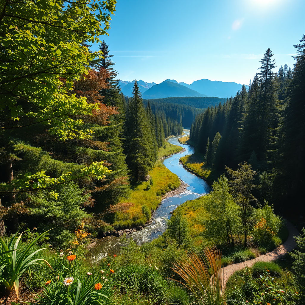Immersive landscape with a lush, vibrant forest showcasing a rich tapestry of greens and earthy browns, sunlight filtering through the dense canopy casting dappled patterns on the forest floor, deep focus on a serene, winding river reflecting the clear blue sky, scattered wildflowers adding bursts of color, a gentle breeze rustling the leaves, distant mountains providing a majestic backdrop, creating a sense of depth and tranquility.