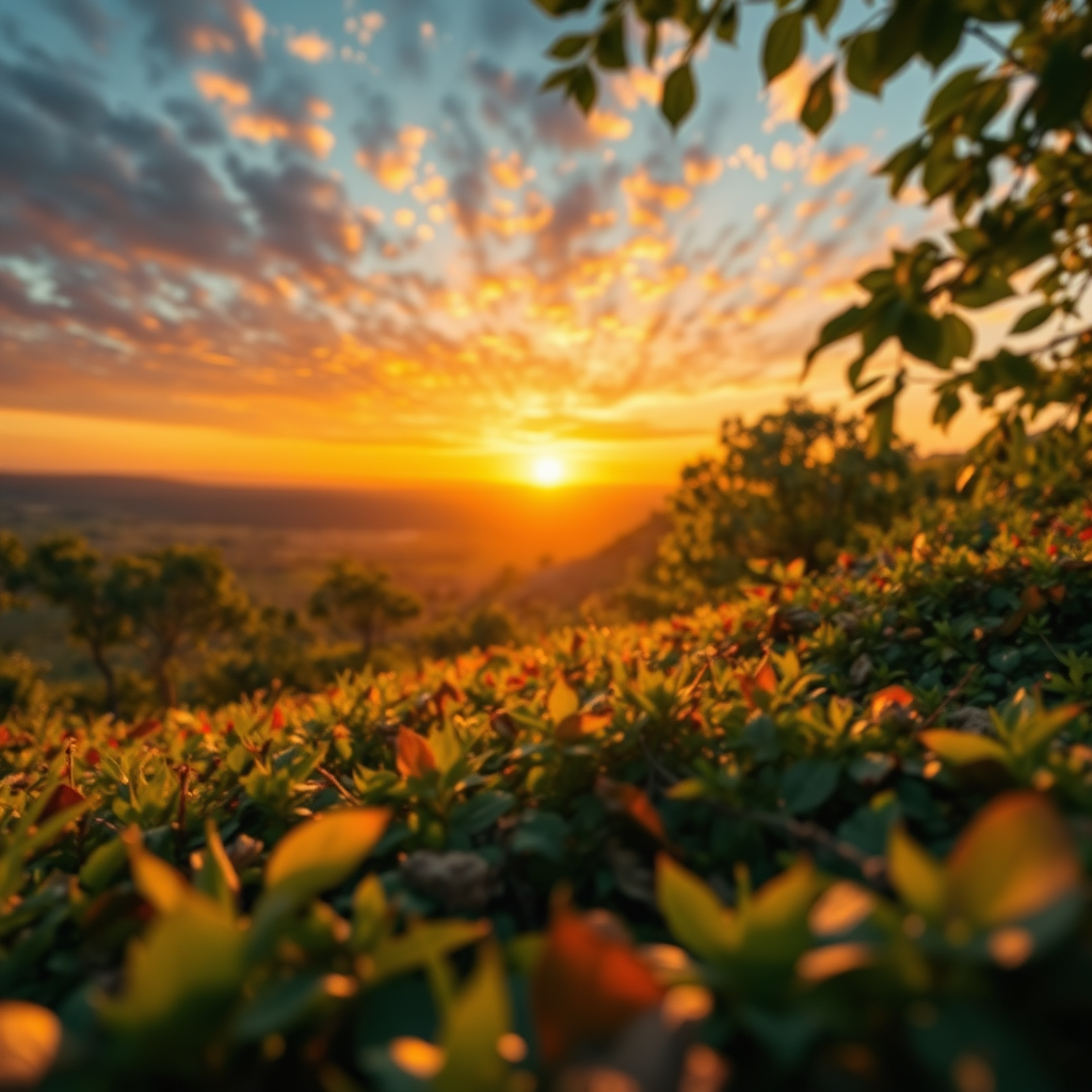 immersive landscape with a rich depth of field, vibrant colors blending seamlessly, intricate details in foreground and background, dynamic lighting casting soft shadows, the atmosphere of a tranquil sunset, scattered elements of nature harmoniously integrated, subtle textures giving a lifelike feel, gentle breeze implied through the motion of leaves