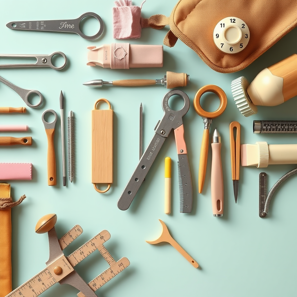 Impeccably arranged explorer tools in a meticulously organized layout, featuring a Wes Anderson-inspired color scheme with pastel hues and complementary contrasts, captured with soft studio lighting, maintaining a gentle, low contrast setting, rendered in ultra-high-definition clarity.