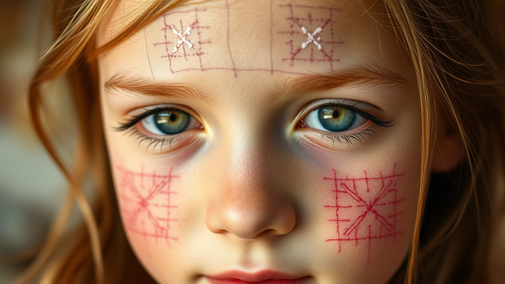 Imperfectly stitched embroidery patterns across a girl's face, visibly rough textures, authentic raw aesthetic, untouched by digital enhancement, natural lighting, --ar 3:2 --stylize 250.