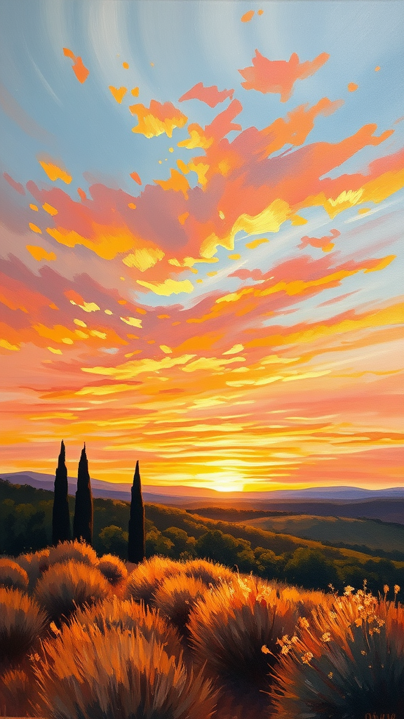 Impressionist canvas depicting a serene evening in Provence, capturing a vivid sunset with a symphony of warm, glowing colors. The scene is brought to life with gentle, flowing brushstrokes reminiscent of the great impressionist artists, creating an evocative atmosphere. The elongated composition emphasizes the expansive sky, where hues of orange, pink, and gold blend harmoniously. The landscape exudes a tranquil charm, inviting the viewer to immerse themselves in the enchanting beauty of Provence at dusk, where every stroke echoes the mastery of the impressionist style.