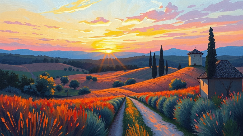 Impressionist landscape on canvas, twilight in the Provence countryside, evoking the style of impressionist painters, soft and vivid tones, gentle brushstrokes, capturing the warmth and tranquility of dusk --ar 1:2 --stylize 500