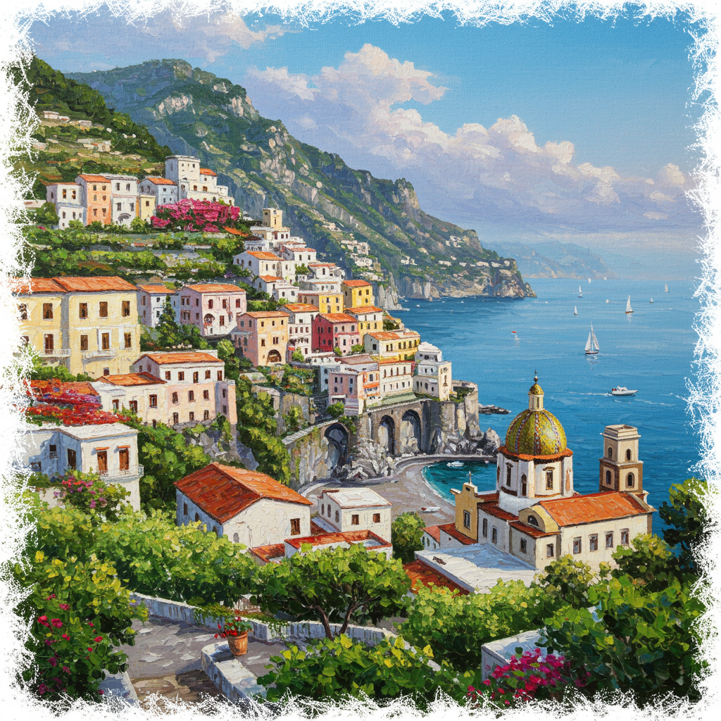 Impressionist oil painting of the Amalfi Coast on a bright, sunny day. Lively, colorful buildings and charming domes perch atop cliffs, gazing out over the serene sea with sailboats dotting the horizon. The lush greenery cascading down the cliffs adds a vibrant, verdant touch. The scene comes alive with vibrant colors and detailed brushstrokes, with a textured canvas effect enhancing its impressionistic technique. The artwork is high resolution, capturing the essence of Mediterranean beauty with a creative flair, evoking the allure of warm Italian landscapes.