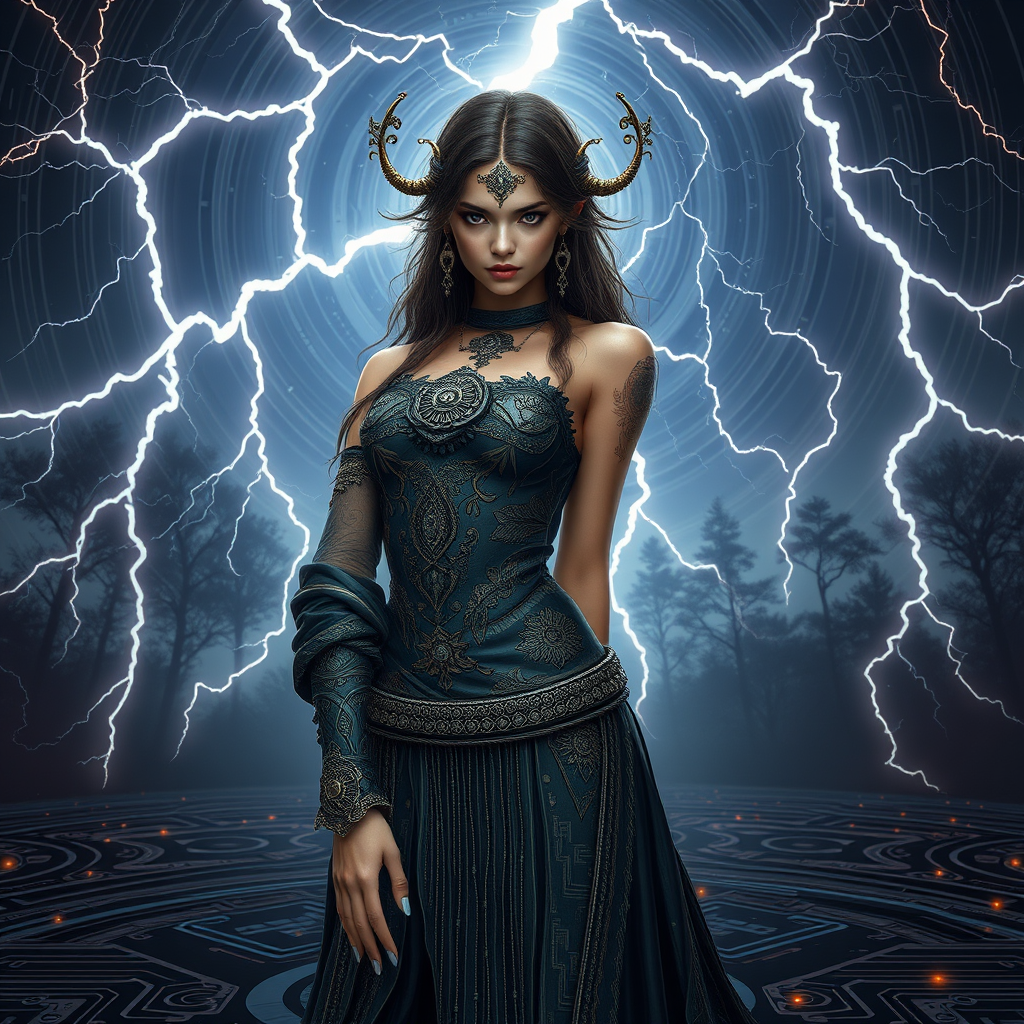 In a backdrop of spiral lightning, a magnificent young woman stands confidently on a ground of circuit board patterns. She has a flawless, beautiful face and is portrayed in a realistic, full-body depiction. Her intricate clothing embodies an elegant pose, evoking a fantasy realm. This illustration could be found on ArtStation, characterized by a hyper-detailed maximalist style that combines cinematic tribal dark fantasy elements. The scene features an epic, moody forest in the background, captured in ultra-high-definition with 8k resolution and produced using ultra-detailed quality 3D Octane rendering. Her photorealistic concept art presentation showcases sharp focus and perfect composition, enhanced by an evil smile and wild, captivating eyes. Her hands, lips, and eyes are depicted with meticulous perfection, designed as wallpaper with HDR, promising high quality, high-definition imagery.