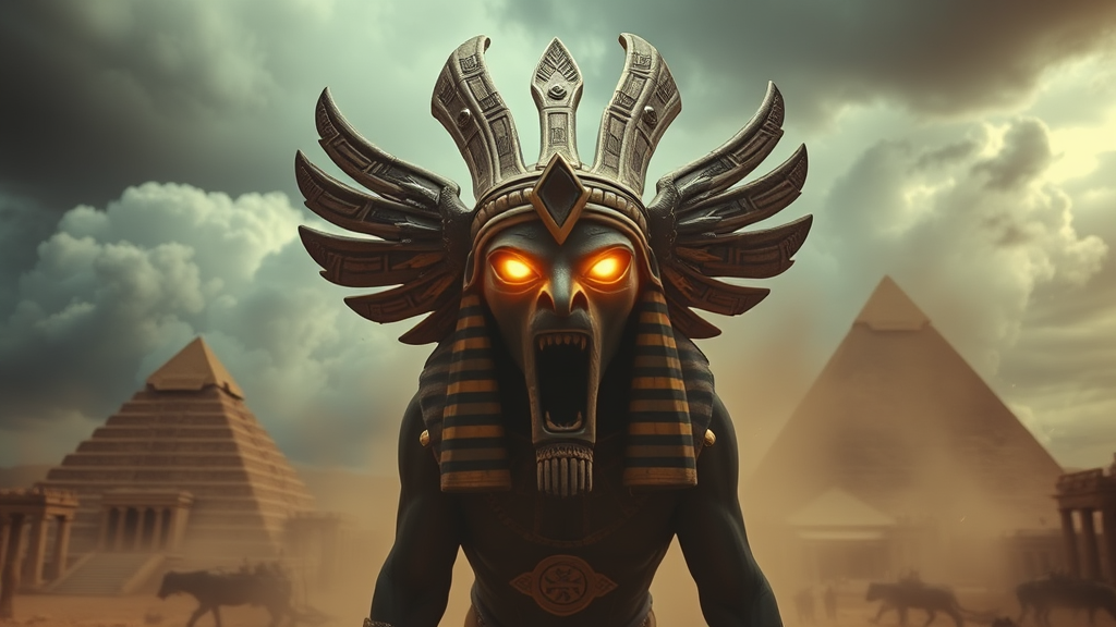 In a breathtaking cinematic scene, the Egyptian god Horus unleashes his terrifying wrath upon mankind, his eyes glowing with a sinister light. The full-length depiction captures the fierce intensity of his divine fury, set against a photorealistic backdrop of ancient desert landscapes and stormy skies, creating an atmosphere of awe and dread.