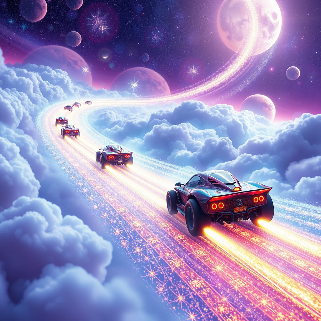 In a breathtaking magical realm, an epic and adrenaline-fueled car race unfolds, inspired by the fast and furious spirit of high-speed competitions. These awe-inspiring fantasy cars, infused with mystical energy, race through the sky on a track woven from shimmering stardust clouds, defying the very laws of gravity. As they navigate this ethereal course, the cars leave trails of sparkling magic in their wake, weaving through celestial obstacles and swirling vortexes. The roar of enchanted engines harmonizes with the astral wind, as drivers, infused with courage and skill, push the limits of both machine and magic, vying for victory in the race of a lifetime.
