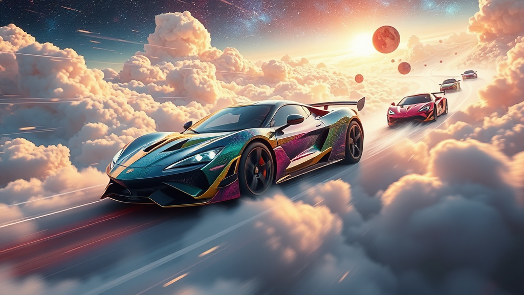 In a breathtaking magical realm, an exhilarating spectacle unfolds as fantastical sports cars, imbued with arcane power, speed through the skies atop shimmering clouds. These enchanted vehicles, crafted with vibrant colors and otherworldly designs, defy gravity as they twist and turn through the celestial raceway. The race is a symphony of roaring engines and dazzling light, capturing the adrenaline-fueled spirit of speed. As they navigate through ethereal obstacles and meteor showers, drivers channel their magic, merging man and machine in a thrilling quest for victory amongst the stars.