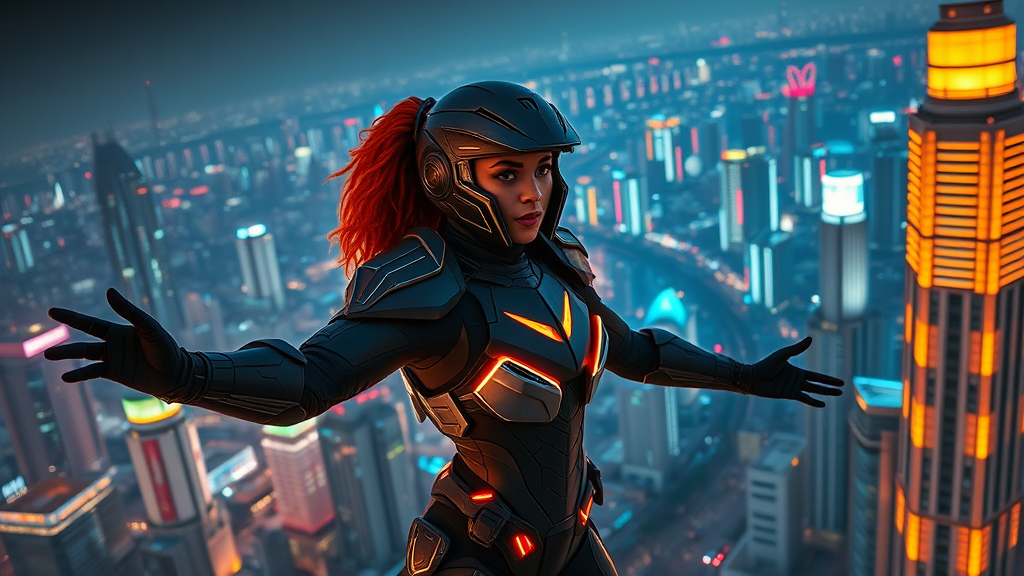 In a breathtaking scene, a black woman with striking ginger hair stands atop a towering skyscraper in an action-packed pose, her arms extended as if embracing the city below. She wears sleek, angular armor that pulses with neon lights along its edges, creating a captivating contrast against the night sky of Neo-Tokyo. The background is filled with mesmerizing skyscrapers aglow with vibrant neon lights, and flying cars whiz by in a symphony of futuristic motion. As the camera zooms in, her face is beautifully illuminated by a holographic display projected from her helmet, highlighting her determined expression. With advanced sensor technology at her disposal, she meticulously scans the sprawling cityscape for any signs of danger or unrest. The film is a thrilling blend of cyberpunk aesthetics reminiscent of Blade Runner, the high-octane action of Starship Troopers and Dredd, and the imaginative world-building that only directors like Ridley Scott and Ava DuVernay could deliver. It promises a visually stunning adventure centered on a powerful and empowered black female protagonist, crafted with photorealistic detail, soft lighting, intricate textures, and a hyperrealistic aesthetic.