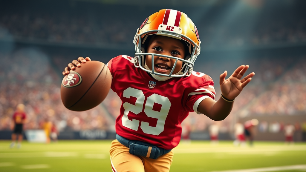 In a breathtaking scene, a young African American toddler embodies the spirit of a San Francisco 49ers football star, donned in a vibrant red and gold uniform complete with a gleaming helmet. Captured mid-action, the toddler dashes forward with infectious joy, clenching the football tightly as he celebrates a triumphant touchdown. The atmosphere buzzes with excitement under dramatic lighting, showcasing the dynamic movement and pure elation of the young athlete. This hyper-realistic, photo-realistic HD render is professionally shot on a Canon EOS-1D X Mark III, perfectly capturing the essence of youthful exuberance and the thrill of victory.