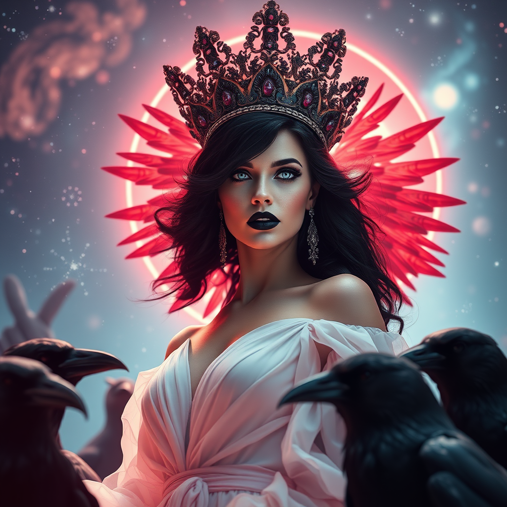 In a breathtaking scene, the beautiful queen of ravens stands in commanding action, her presence both dramatic and enigmatic, embodying the archetype of a femme fatale. Her black plumes flow around her as she directs the ravens with an imperious grace. Her icy blue eyes, akin to Pantone 2766, strike a stark contrast against her black lipstick and cascading black hair. The setting evokes a mystical World of Warcraft ambiance, psychedelic and otherworldly, suggesting a journey through a cosmic birth canal. She is adorned in a silk gossamer dress, ethereal and light, as stars and galaxies swirl in the background, creating a sense of infinite space. The full-body portrait captures her in a low-angle shot, accentuating her ornate, ethereal crown. The scene is bathed in god rays and radiant light, imbuing the atmosphere with a divine presence. An iridescent red halo hovers behind her, casting an ultra-realistic glow. The meticulously detailed environment exudes a macabre dark fantasy, with elements worthy of a high-stakes art station display. This atmospheric hyperrealism is rendered with stunning detail and sharp focus, an epic wide shot that blends ultra-realistic illustration with photographic realism. The use of octane render techniques enhances the cinematographic quality of the scene, making it an insanely detailed masterpiece that captures the essence of a commanding, enigmatic queen of ravens in her element.