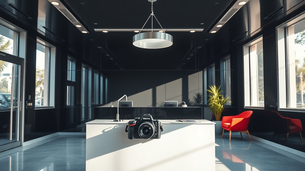 In a bright and welcoming reception area, a stylish desk sits beneath a chic pendant light, while a Nikon Z9 camera rests prominently as a centerpiece. The backdrop is a polished, glossy black, subtly glowing with sunlight that streams through large windows. The atmosphere is playful and vibrant, exuding a sense of modern elegance and charm.