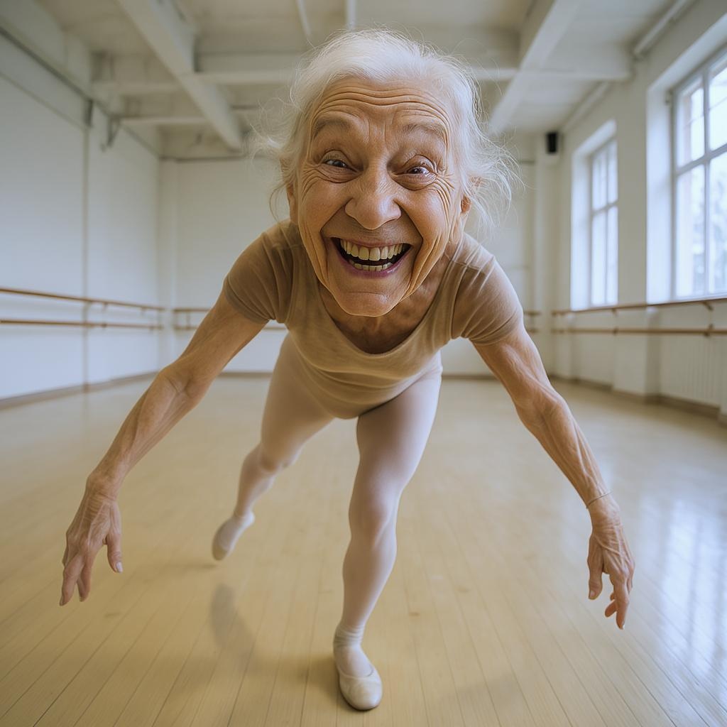 In a brightly lit dance studio, an elderly ballerina gracefully performs a plié, her well-worn leotard hugging her figure as she bends at the knees. The scene is captured through a wide-angle lens, emphasizing the depth and space around her. Her expression is humorously joyful, a playful sparkle dancing in her eyes as a wide grin spreads across her face. The camera focuses sharply on her face, highlighting the symmetry and character etched into her time-weathered features, capturing a moment of unexpected and comical joy in the elegance of her movement.