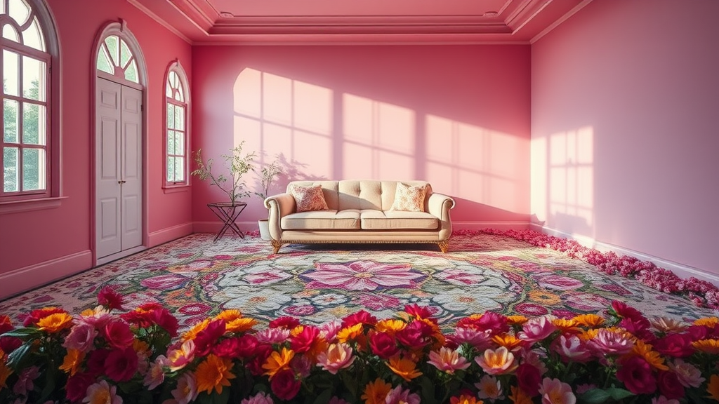 In a brightly lit, magical room, the walls are painted in enchanting shades of pink, creating a zen-like atmosphere that feels both dreamy and dramatic. A plush couch sits invitingly on an exquisitely designed floral rug that almost appears to bloom with fantastically gaudy colors. The room exudes an ambiance of magic and serenity, with a beautiful aesthetic that merges a fantastical environment with a sophisticated design. The floor is adorned with a bed of vibrant flowers, enhancing the sense of being in a whimsical, enchanting space where every detail contributes to a dazzling, floral wonderland.