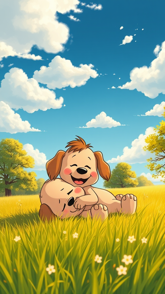 In a broad meadow under a vivid blue sky dotted with fluffy white clouds, a lovable puppy rests in the embrace of a smiling child. The scene is bathed in golden spring sunlight, with lush green trees swaying gently in the background. This heartwarming moment is captured with the playful and expressive style reminiscent of Charles M. Schulz.