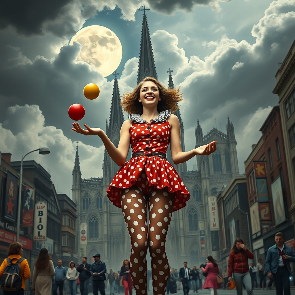 In a bustling city scene, a joyful woman stands in the foreground, embodying the playful spirit of a classic clown while exuding the allure of a vintage pin-up model. Her kind smile radiates happiness as she juggles a set of vibrant balls, captivating onlookers. Her outfit, a fusion of bold polka-dot leggings and a whimsically styled costume, reflects her generous and vivacious character. Behind her, the majestic silhouette of a grand cathedral rises against an ominous sky, partially obscured by swirling clouds. The full moon casts an ethereal glow, its light filtering through the clouds with a dramatic, volumetric effect. This hyper-realistic scene, reminiscent of Frank Frazetta’s masterful oil paintings, captures the dynamic energy and intrigue of this captivating moment amidst an enchanted urban landscape.