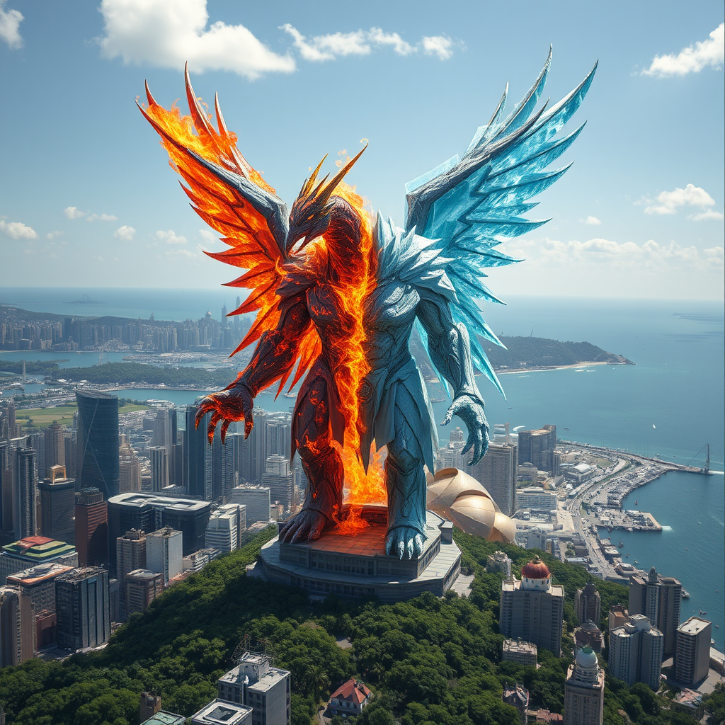In a bustling cityscape teetering on the brink of elemental chaos, stands an awe-inspiring sentinel, a majestic guardian harmonizing the forces of both destruction and preservation. Its form is a breathtaking marvel, with one side fiercely ablaze in untamed flames, while the other is wrapped in a fortress of solid ice armor. The creature's mighty wings stretch wide, casting a shadow over a metropolis caught between a storm of fire and an expanse of icy seclusion. Around this stoic being, human activity persists undisturbed under clear skies, with calm oceans reflecting the vibrant hues of untouched greenery. The daytime sun shines brightly upon green landscapes, where colorful flora thrives amidst ordinary wildlife. Despite the asymmetrical elemental distribution embodied by the sentinel, mundane city life continues with functional technology and unaffected buildings, creating a juxtaposition of serene skies and the elemental battleground beneath.