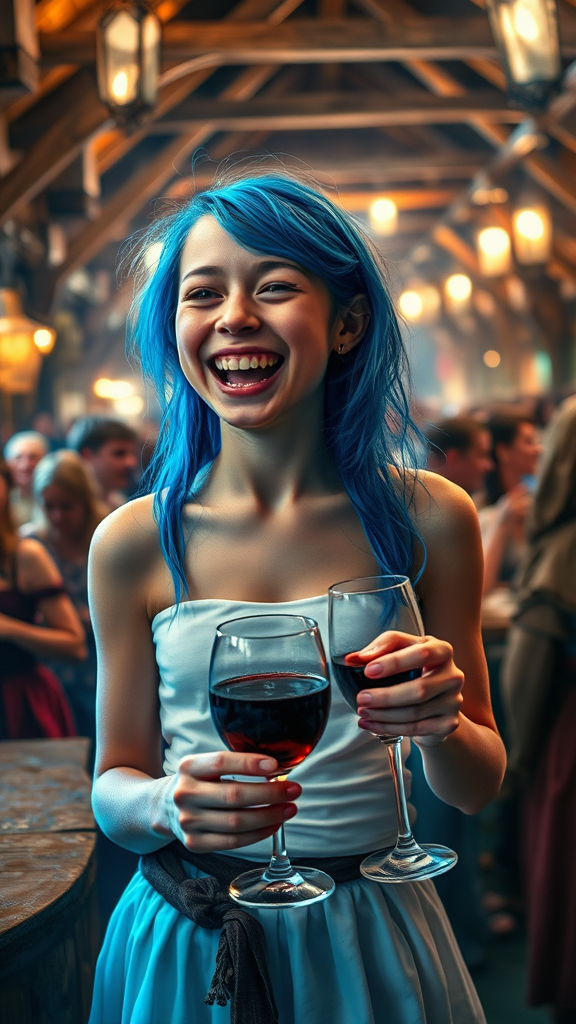 In a bustling medieval tavern filled with lively peasants in the background, a young girl, adorned in a pristine white strapless tube top, is captured in a moment of pure joy. Her vibrant blue hair cascades around her shoulders as she laughs heartily, holding a goblet of rich red wine. The scene is illuminated by ethereal blue volumetric lighting, adding a magical touch to the atmosphere. The girl's expression is one of infectious happiness, her eyes twinkling with mischief and delight. The setting is ultra-detailed and ultra-realistic, as if lifted from a high-definition fantasy movie, capturing every texture and nuance of the tavern's rustic charm and the girl's vibrant presence. The cinematic composition and exquisite details create an immersive 8k visual experience, as the chaos of the lively surroundings adds a dynamic energy to the scene.