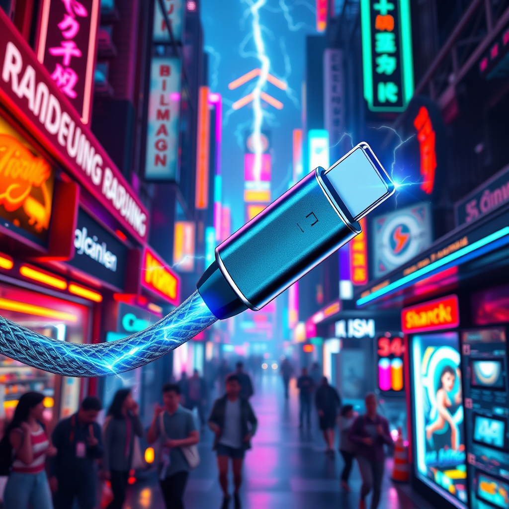 In a bustling neon-soaked marketplace of a futuristic city, a holographic display showcases a cutting-edge cyberpunk USB Type C charging cable. Known as the "Lightning Vortex," this cable boasts an impressive 6A 120W power for unrivaled speed. Its sleek, iridescent finish pulses with a dynamic light, echoing the rapid energy flow within. Equipped with an innovative, ever-glowing indicator, the Lightning Vortex ensures you stay connected with unmatched efficiency and style, perfectly embodying the spirit of a high-tech world thriving amidst a vibrant urban sprawl.