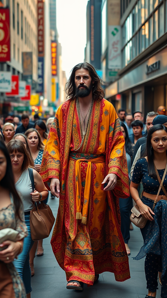 In a bustling New York street scene, Jesus, donned in vibrant, bohemian attire reminiscent of a 1960s hippie, walks amidst the lively crowd. His flowing robe, adorned with intricate patterns, sways gently as he moves, harmonizing with the rhythm of the city. Around him, people from all walks of life, diverse in culture and style, continue their daily hustle, some casting curious glances and others engrossed in their routines. The photograph captures this moment with cinematic, ultraphotorealistic detail, every face, every texture rendered in crisp HDR quality, showcasing the vibrancy and energy of 8k resolution.