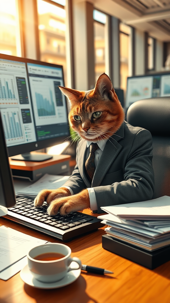 In a bustling office, a photorealistic scene captures a cat dressed in a tailored business suit, tapping away at a keyboard with remarkable human-like precision. The cat, with its sleek fur and expressive eyes, sits at a modern desk cluttered with documents, a steaming cup of coffee, and a high-resolution computer monitor displaying intricate spreadsheets. Sunlight streams through large windows, casting a warm glow that highlights the fur's detailed patterns, creating an atmosphere of professional efficiency. The high-resolution image, a true masterpiece, vividly brings to life this imaginative fusion of feline grace and human diligence.