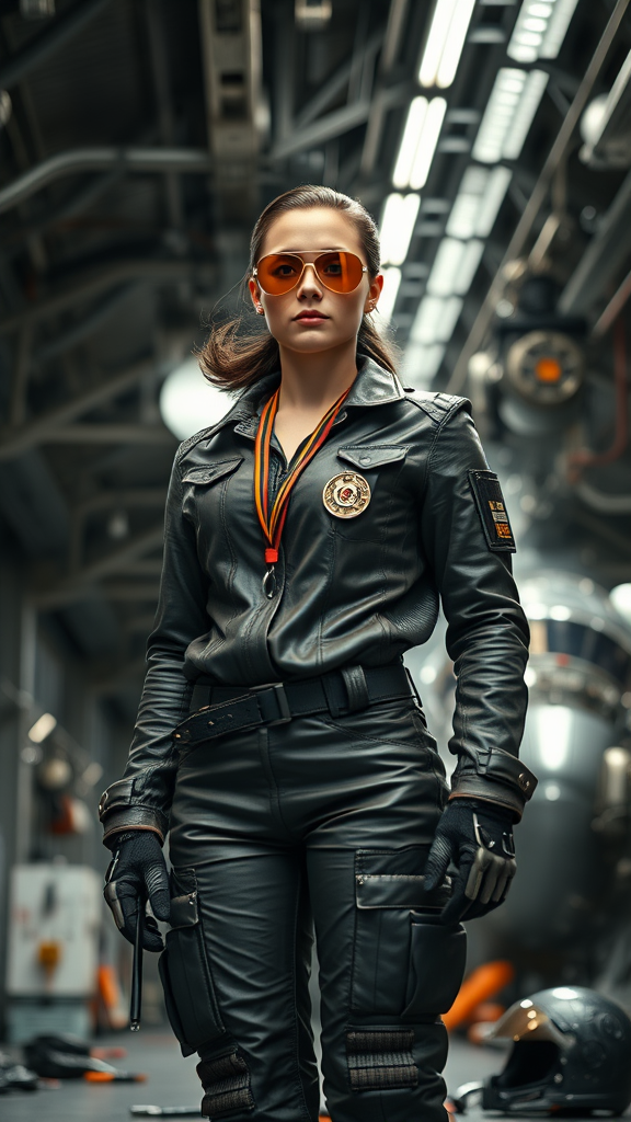 In a bustling spacecraft hangar, a heroic female mechanic stands poised for action. She wears an intricately detailed formal Oak Cool Pewter leather uniform, seamlessly blending sci-fi and cyberpunk aesthetics. The uniform is adorned with medals, highlighting her achievements, and paired with a practical utility belt. The scene is illuminated by dramatic cinematic lighting, emphasizing her dynamic action posture. Captured from a low angle, the lighting accentuates her expression of determination, framed by golden pilot sunglasses. The composition showcases highest facial details, capturing the nuance of emotion, in a masterpiece shot depicted in 8k resolution. Her uniform exhibits realistic fabric details and folds that defy boring standards, meticulously avoiding any semblance of being badly drawn or uninspired. The simple, monochrome background ensures she remains the focal point, minimizing low background contrast and background noise. Hand tools are scattered about as she stands amidst gleaming spacecraft components, evoking a sense of adventure and precision. Nearby, a hard surface helmet rests, symbolizing her readiness for further exploits. Subtle flags, featuring the stars and stripes and the union jack, flutter in the background, adding a touch of national pride. The scene is a celebration of skill and ingenuity in a futuristic setting.
