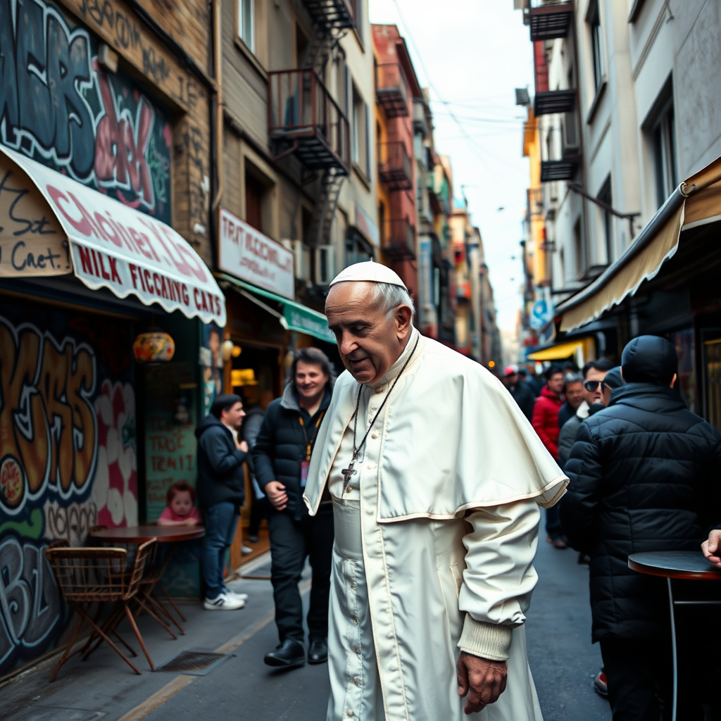 In a bustling urban neighborhood, the pope, draped in a voluminous snow-white bomber jacket, strolls through the vibrant streets, his presence a curious blend of tradition and modernity against the backdrop of graffiti-covered walls and lively chatter from corner cafes.