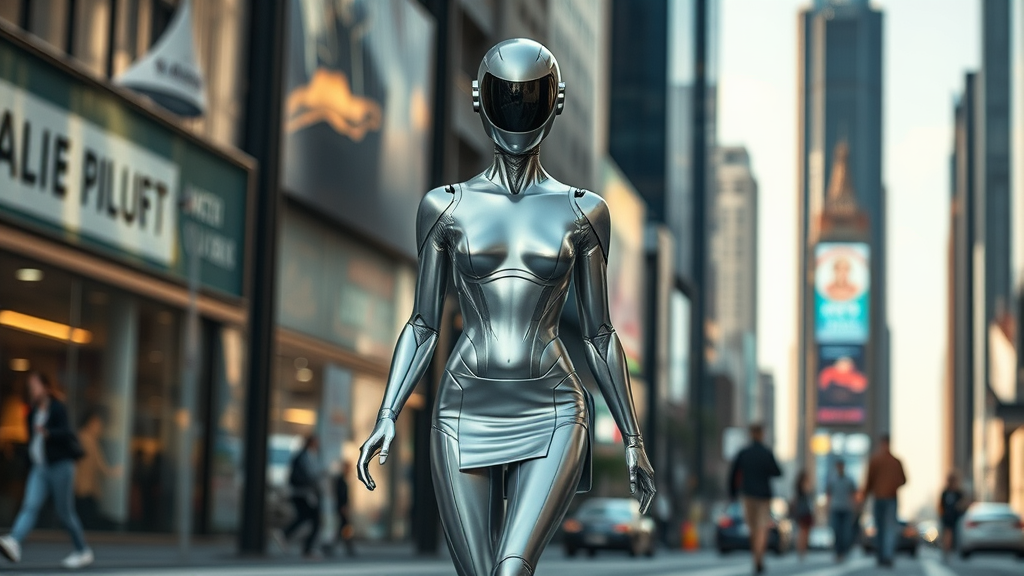 In a bustling urban setting, a striking figure emerges — a futuristic fusion of technology and human-like elegance. This entity, an android with a lustrous silver metallic body, moves gracefully down the street. Donning a modern mini skirt, it captures attention with a faceless visage, reflecting an air of mystery. It strides confidently along the cityscape, locking its non-existent eyes on the viewer, inviting intrigue. The scene, captured in photo-realistic detail, shows its flawless, human-like skin, intricately crafted to resemble a living organism. The photography showcases its full-length form with exceptional sharpness and detail, utilizing soft diffused lighting to create a hyper-realistic and cinematic effect. Despite being a model of perfection, subtle imperfections like occasional jpeg artifacts and slight blurring add an element of authenticity to the digital artistry. The android challenges the boundaries of design, harmoniously blending the organic with the synthetic.