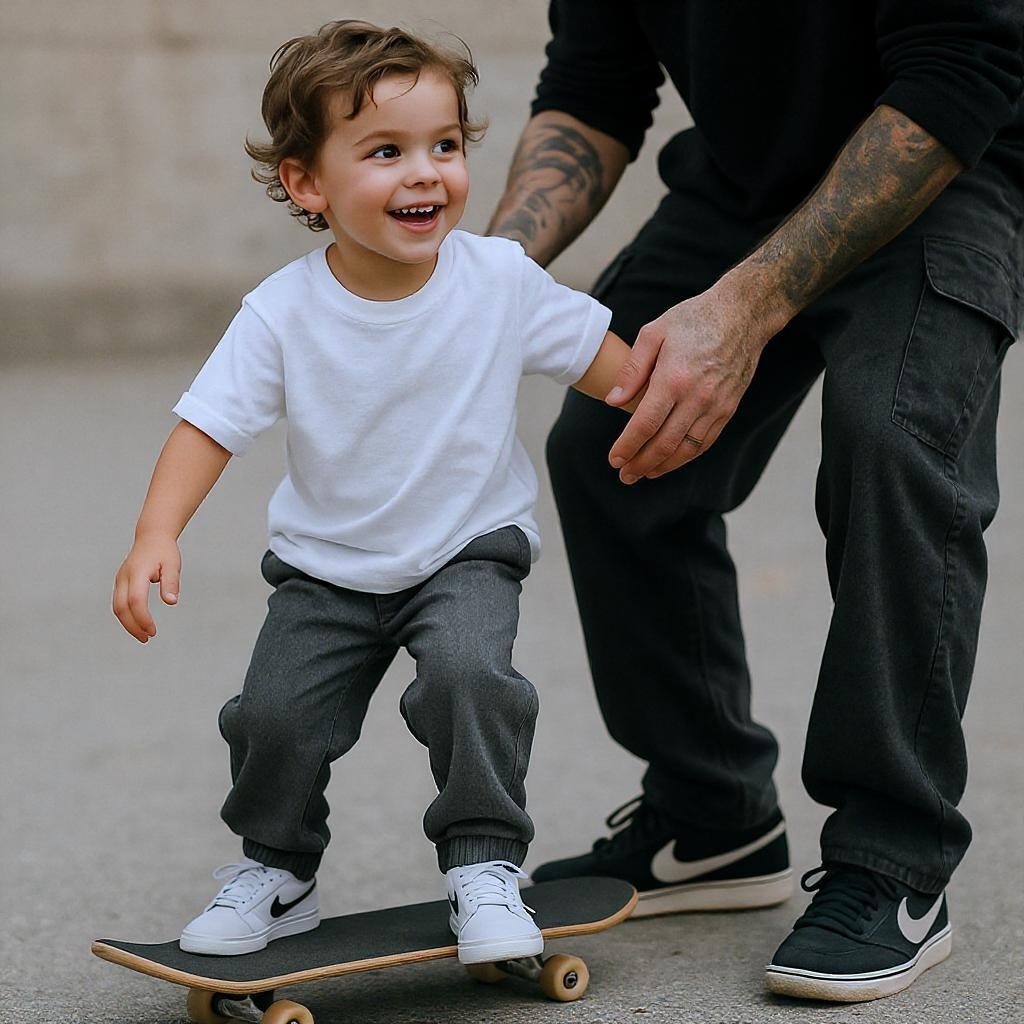 In a candid moment captured in stunning detail, a young boy and his father share a joyful experience on a skateboard. The boy, exuding a playful yet cool vibe, wears a white, loose-fitting T-shirt paired with dark grey cargo joggers. His wide grin mirrors the delight of the adult beside him, whose sturdy hands guide him with care. The father's lower half, clad in a black, loose-fit long-sleeve shirt, reveals arms adorned with intricate tattoos, adding a layer of character and narrative to the shot. Both are sporting Nike SB skateboarding shoes, the father's shoes appearing comfortably worn while the boy's are crisp and new, symbolizing a beautiful contrast of experience and youth. The scene is bathed in soft, natural light, highlighting the shared joy and perfect balance between the two generations. Captured on a Sony α9 II with a Sony FE 100-400mm f/4.5-5.6 GM OSS lens, the image showcases a high-contrast effect, bringing out the textures and emotions with a UHD resolution, offering an intimate glimpse into a moment of connection and legacy.