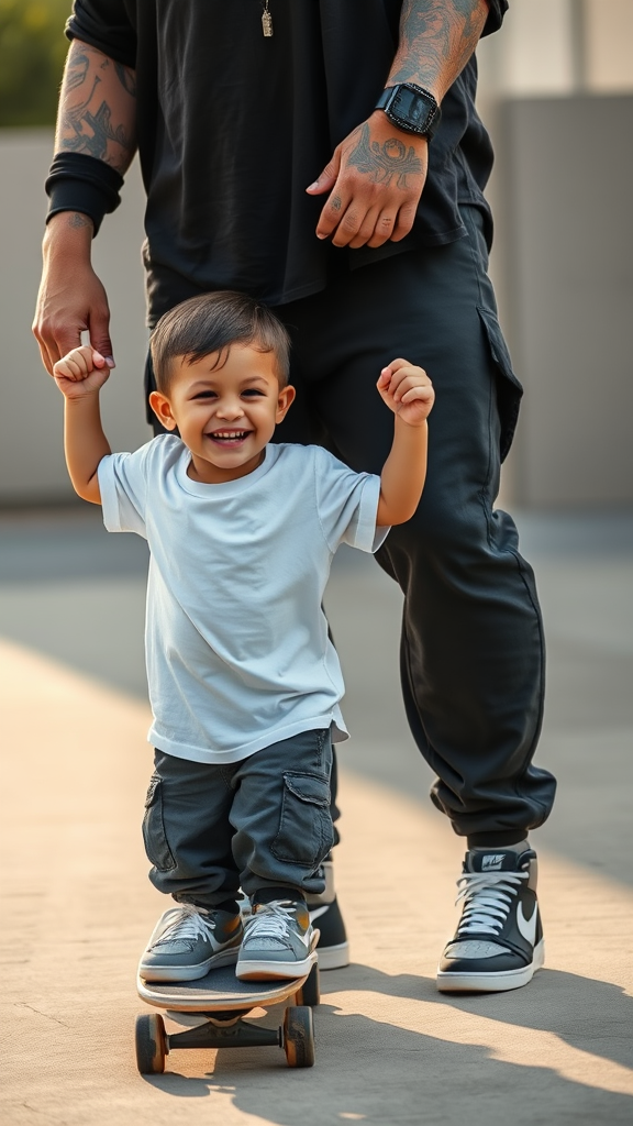 In a candid shot capturing pure joy, a young boy grins widely while balancing on a skateboard, his white oversized T-shirt exuding a playful, cool vibe. The loose dark grey cargo joggers add to his carefree look. Holding onto the strong hands of his father, whose lower body is visible, adorned with intricately detailed tattoos and wearing a black loose-fit long sleeve shirt, the sense of shared happiness between the two generations is palpable. Both wear Nike SB skateboard shoes, illustrating a contrast between the boy's new pair and the father's well-worn ones. Their perfect face-to-body ratio is complemented by the serene, natural light that bathes the scene, captured in high contrast by a Sony α9 II camera with a Sony FE 100-400mm f/4.5-5.6 GM OSS lens. The atmosphere, enhanced by ultra-high-definition quality and a raw styling touch, effortlessly bridges their connection, balanced and full of life.