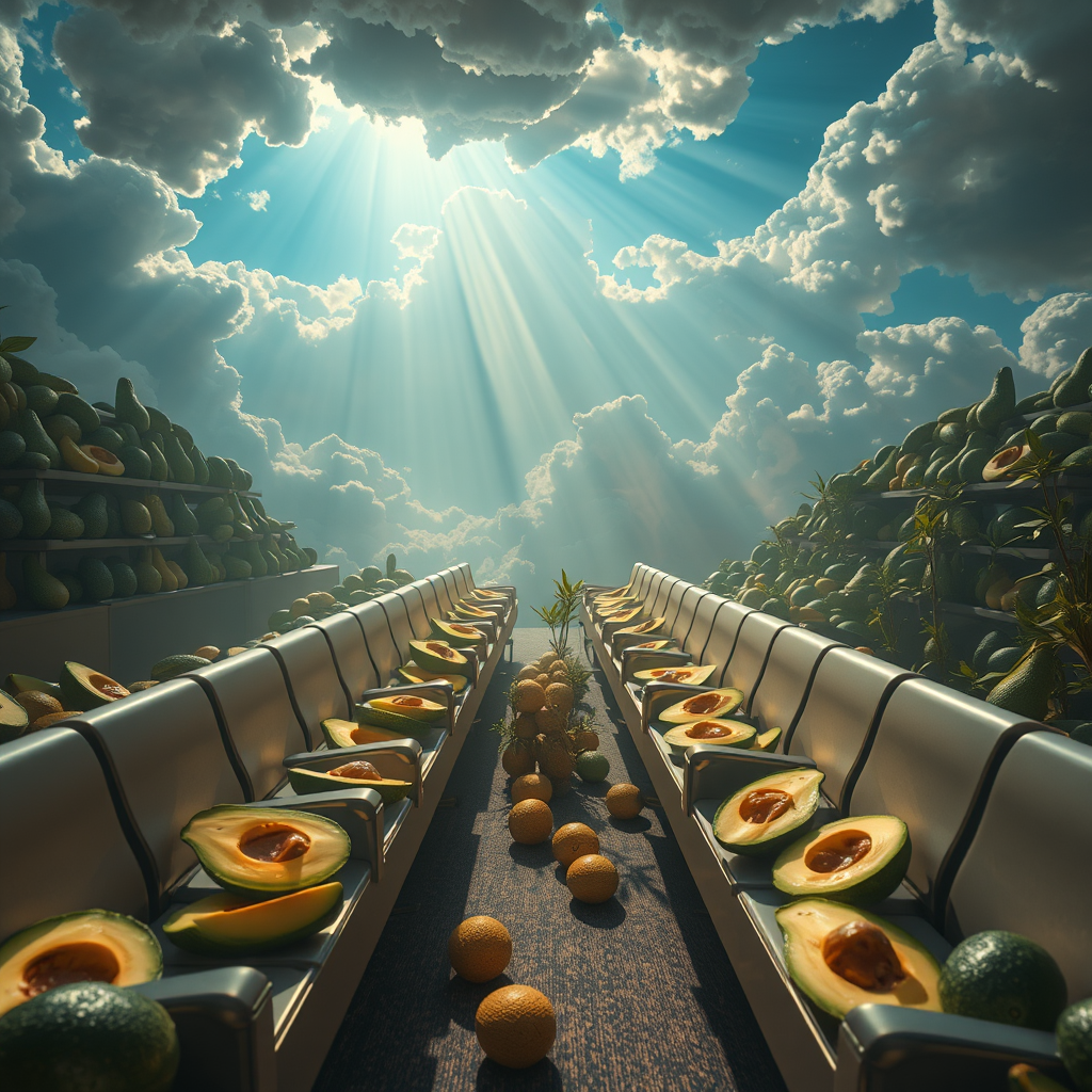 In a celestial waiting room adorned with avocados, radiant god rays cascade through the clouds, casting cinematic lighting across intricate details. A masterpiece of divine design emerges, showcasing unparalleled beauty in stunning 8k clarity, all while exuding a sense of genius and serenity.