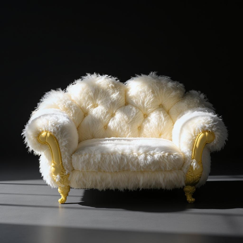 In a cinematic editorial shoot, the focal point is a small fluffy couch inspired by the ethereal nature of clouds, accentuated with intricate yellow material details. The photograph captures the couch perfectly from a front view, utilizing the impressive capabilities of a Sony α7R IV camera teamed with a Sony FE 24-70mm f/2.8 GM lens. The settings are meticulously chosen with an aperture of f/8 for optimal sharpness and a shutter speed of 1/125 to freeze the scene, while maintaining the ISO at 100 to ensure the finest image quality. The composition is enhanced by contrasting highlights and realistic sunlight that accentuates every detail from light patterns to material textures. The solid background provides a glamorous and rich context, with sharp focus and clear detail that offer a seamless blend of innovative design and visual elegance. The image is captured in stunning 16K resolution with rich details, stylized for an artistic touch and personalized with unique elements, evoking a sense of raw cinematic beauty.
