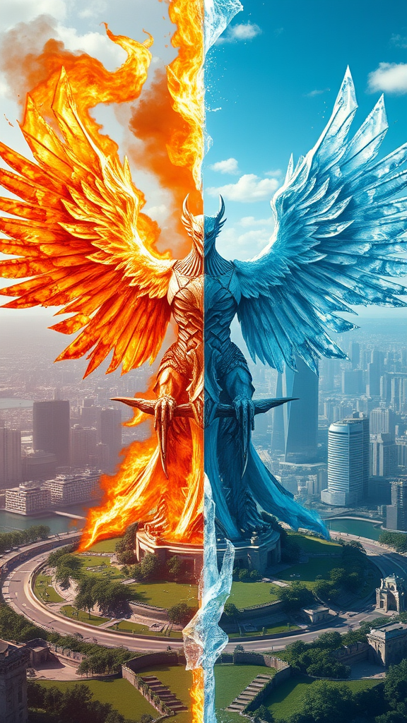In a city divided by the elemental clash of fire and ice, a majestic sentinel stands as both guardian and arbiter. Its towering form embodies the dual forces of destruction and preservation, with one side wreathed in a fierce cloak of wild flames and the other sheathed in unyielding ice armor. The sentinel stretches its mighty wings wide, casting an imposing shadow over landscapes untouched by the conflict, where green expanses thrive under serene skies and daytime's direct sunlight nurtures vibrant flora. Amidst this juxtaposition, the city's mundane life continues unaffected, with human activities bustling under clear weather, calm oceans, and functional technology securing unfazed buildings. The asymmetrical elemental distribution highlights the delicate balance between heat's fury and cold's calm, where ordinary wildlife roams freely, navigating the dichotomy of fiery destruction and icy preservation within this vibrant yet peaceful realm.
