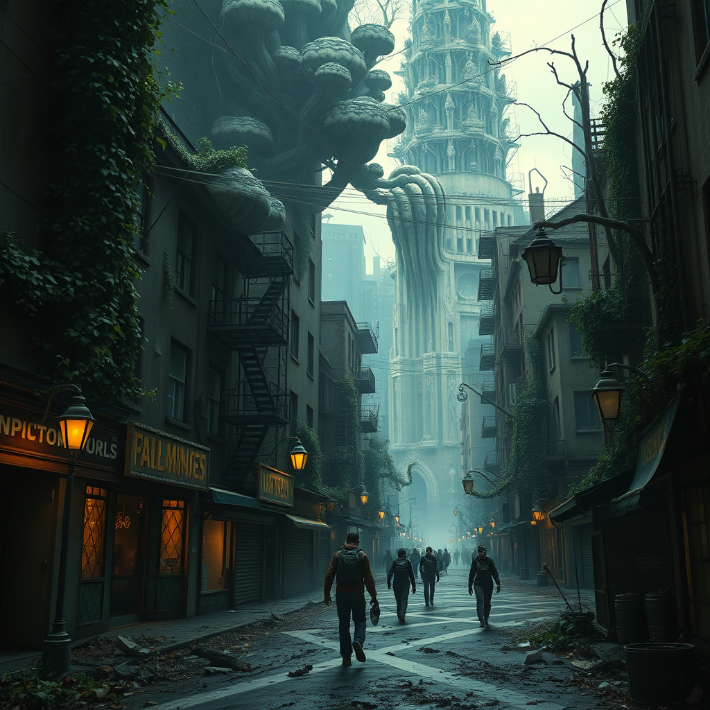 In a city once bustling with life, now taken over by nature's reclaiming grip, a fungal infestation known as Ophiocordyceps thrives, blurring the line between the living and the dead. The remnants of humanity navigate crumbling streets overshadowed by towering spore-covered edifices, where the air hangs heavy with a sense of haunting beauty and peril. Vines entwine with darkened street lamps, and every shadowed corner holds the potential for danger, as humanoid figures, grotesquely transformed by the parasitic fungus, roam aimlessly. Amidst this eerie urban tapestry, survivors cling to memories of the past, scavenging for remnants of civilization while forging fragile connections in a fractured world.