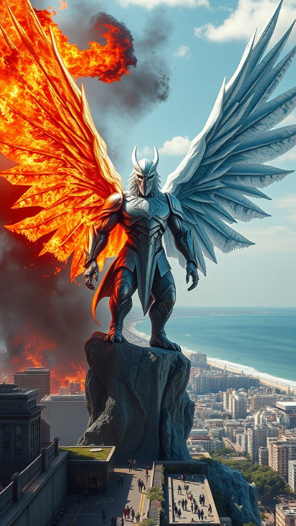 In a city teetering on the brink between fiery chaos and an icy hush, an elemental sentinel stands vigilant. This stoic guardian embodies the dual nature of destruction and preservation; one side roars with untamed flames that flicker and dance, while the other is enveloped in a glacial armor, each detail etched in frost. With wings extended, casting vast, trembling shadows upon the ground, this sentinel arises amidst a world at odds—a blazing inferno on one flank, a crystalline freeze on the other. Yet, outside this tumultuous divide, human life continues unperturbed; people bustle through calm streets under clear skies, their activity a testament to resilience. The ocean nearby laps gently at green landscapes, the horizon stretches with serene skies and the sun shines brightly upon colorful flora and ordinary wildlife. The city remains unaffected, its buildings intact, its technology functioning without disruption. In this tableau, there is an asymmetrical yet harmonious balance of opposing elements, a masterful depiction of the delicate interplay between fire and ice.