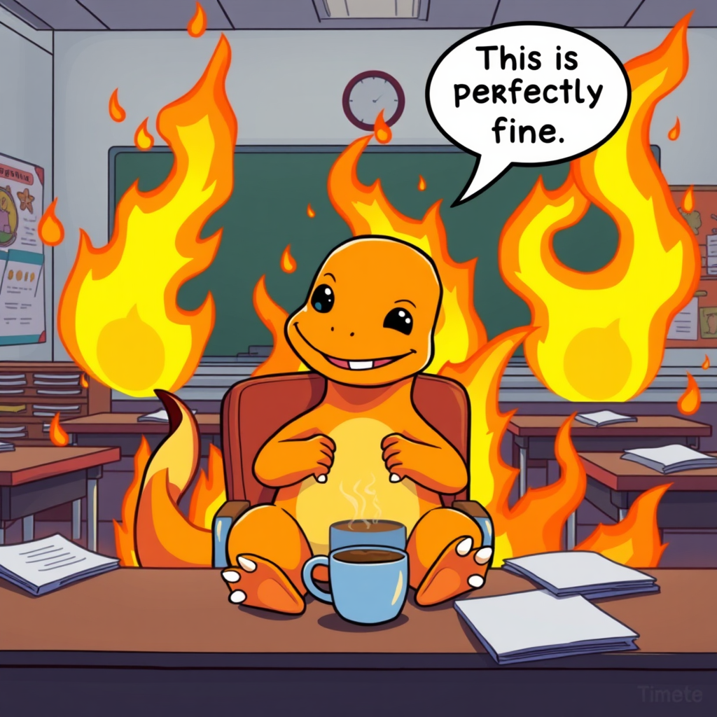 In a classroom engulfed in playful cartoon flames, a highly detailed and adorable Charmander sits calmly in a chair, a steaming cup of coffee in front of him. The little fire-starter grins mischievously, clearly pleased with his fiery handiwork. Above his head, a cartoon speech bubble reads, "This is perfectly fine." The walls of the classroom are decorated with colorful posters, and the desks are scattered with papers and notebooks, adding charm to the chaotic scene.